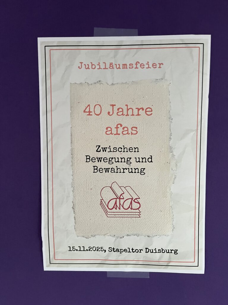 Unsere 40-Jahre-afas-Broschüre ist da! Sie ist rund 100 Seiten stark, erzählt von der afas-Geschichte, der Gegenwart und gibt reich bebilderte Einblicke in unsere Sammlungen. Die Broschüre kann gegen Spende bei uns bestellt werden.
